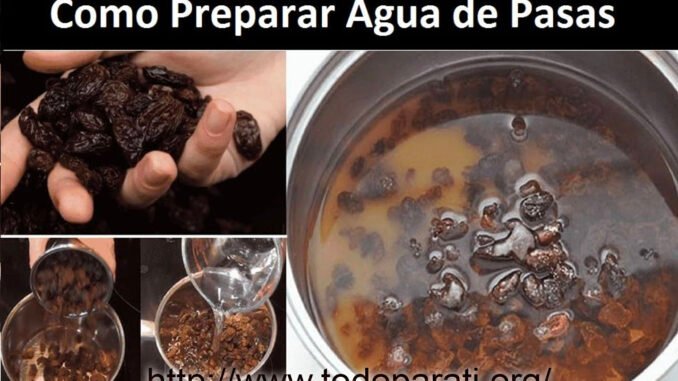- Vierte dos tazas de agua en una olla, agrega 150 gramos de pasas. Ponla a hervir por 20 minutos, hazlo en la noche y deja reposar el agua hasta la mañana siguiente, así puede absorber de manera correcta todos los nutrientes que contienen las pasas.