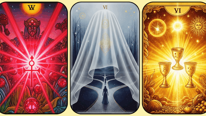 Aquí, ante ti, se despliegan tres misterios, tres caminos que el universo ha dispuesto para tu mirada. Cada uno guarda una parte de tu porvenir, un reflejo de lo que está por venir.